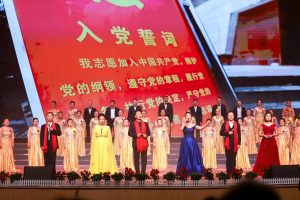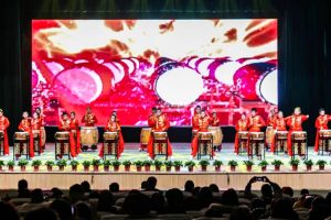 2月4日晚,夏县卫夫人文化中心舞台上,特殊学校在第一届全县少儿春节联欢晚会开场表演的绛州鼓乐《中国龙》赢得广大…