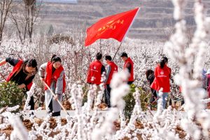 3月27日,果农在夏县瑶峰镇北山底村田间给毛桃树进行疏花作业。当前,夏县万亩毛桃、油桃花竞相绽放,果农们抢抓农…