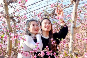 1月27日,来自县城两美女在郭牛村张玉山的大棚里赏桃花、拍抖音。 夏县南大里乡郭牛、北晋等村上百个日光温室里的…