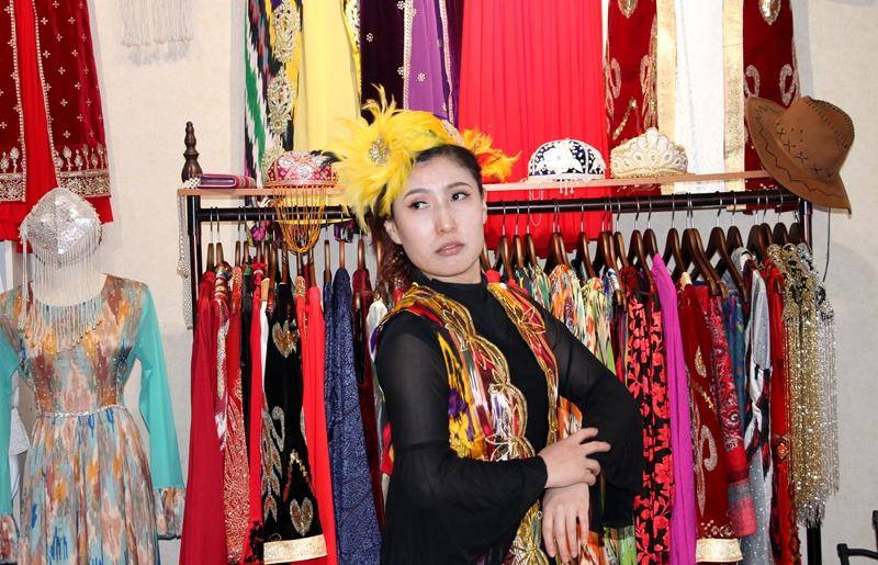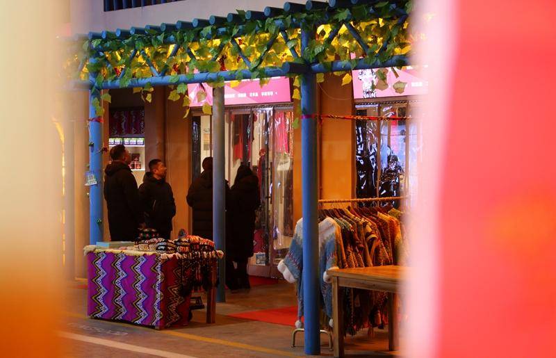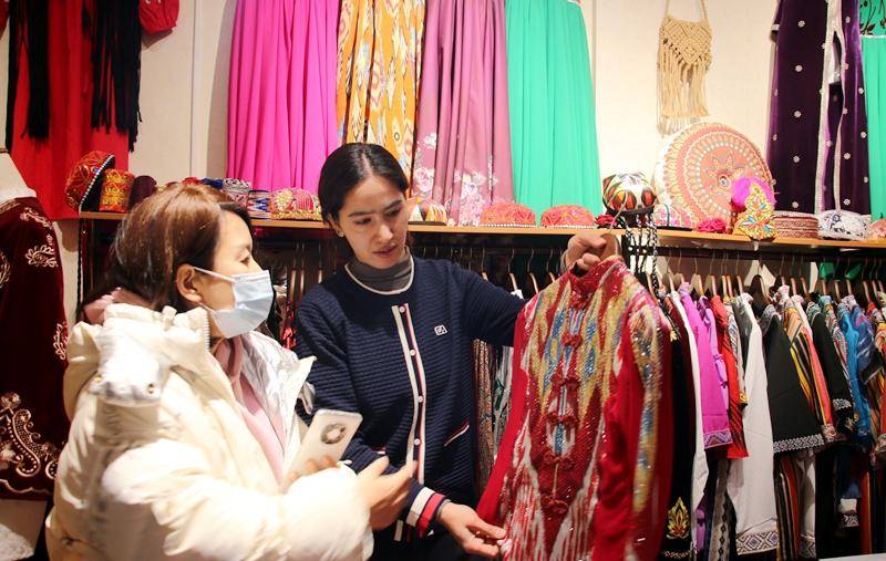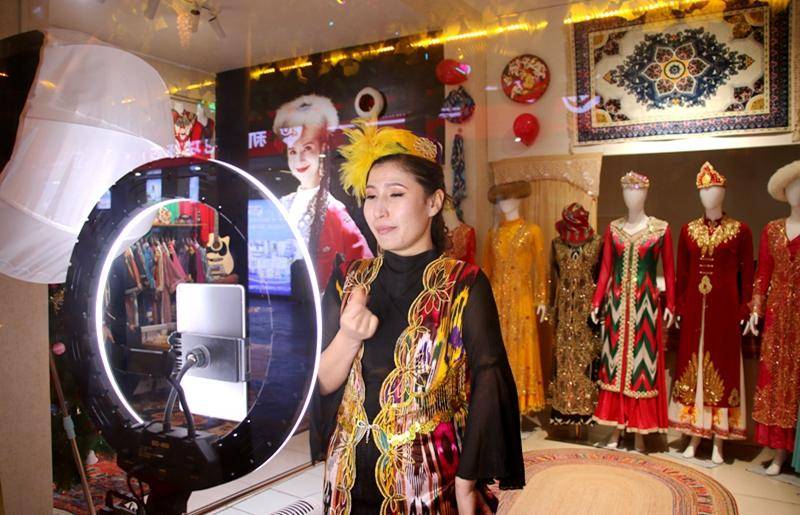 服饰店里,一排排新疆服饰华美艳丽。“这是上好的艾提莱斯布料,大家过年时可以买来感受下西域特色!”新疆姑娘努丽给进店的客人热情介绍这些美丽的服饰,努丽的妹妹则一边随着音乐欢快起舞一边在直播间尽情展示店内服装,热烈的音乐让人忍不住也想舞动起来。