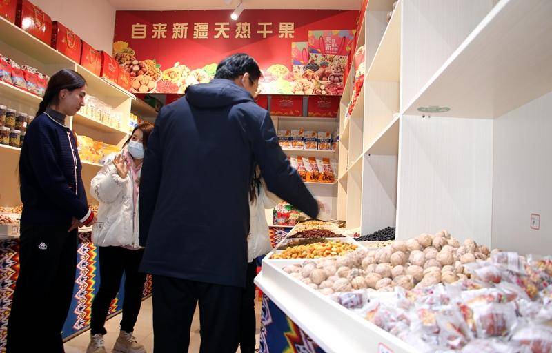 努丽除了经营服饰店,还售卖新疆干果和零食。红妃葡萄干、西梅、新疆奶糖、沙枣、骆驼奶贝……上百种特产令人目不暇接,仅葡萄干就有8种。“这比市面上卖得便宜,味道也正宗!”品尝过后,市民纷纷称赞。为了迎接“年货节”,努丽还特意推出99元3盒共8种干果的优惠活动。“希望大家喜欢我们新疆的特产!”新疆姑娘的美丽和热情令人印象深刻。