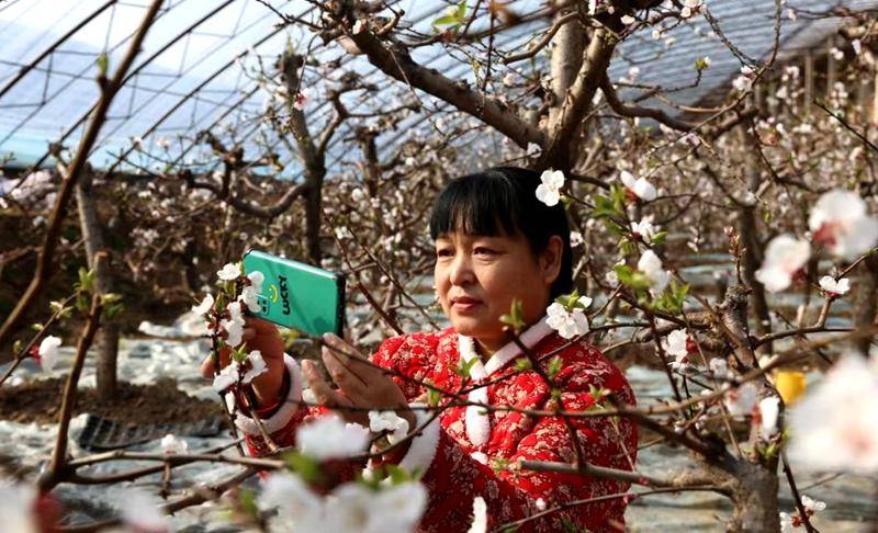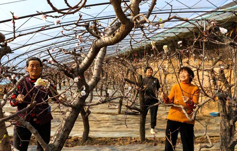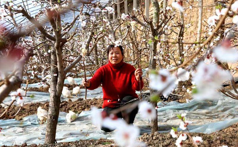 2024年1月14日,寒冬腊月里,山西省运城市夏县尉郭乡青龙新村(东阴)设施大棚里杏花盛开,村民抢抓农时忙着进行沾花授粉,旨在提高杏果的产量和品质。