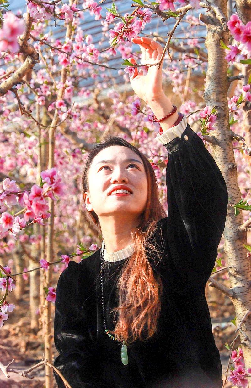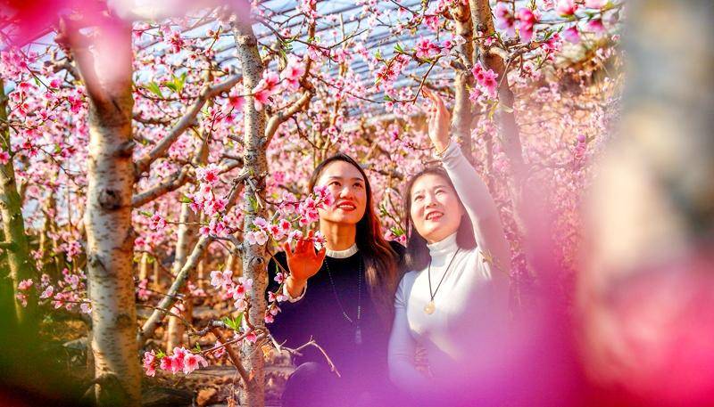 1月27日,来自县城两美女在郭牛村张玉山的大棚里赏桃花、拍抖音。