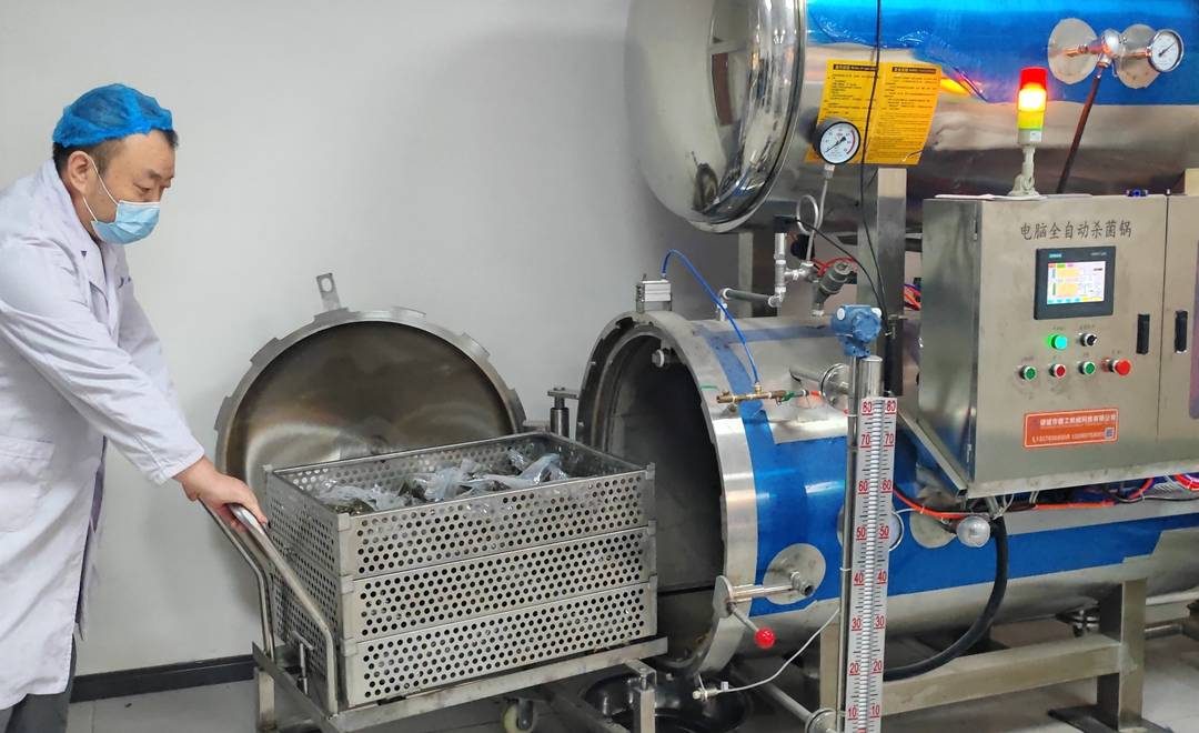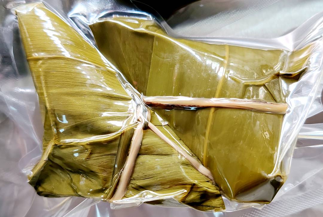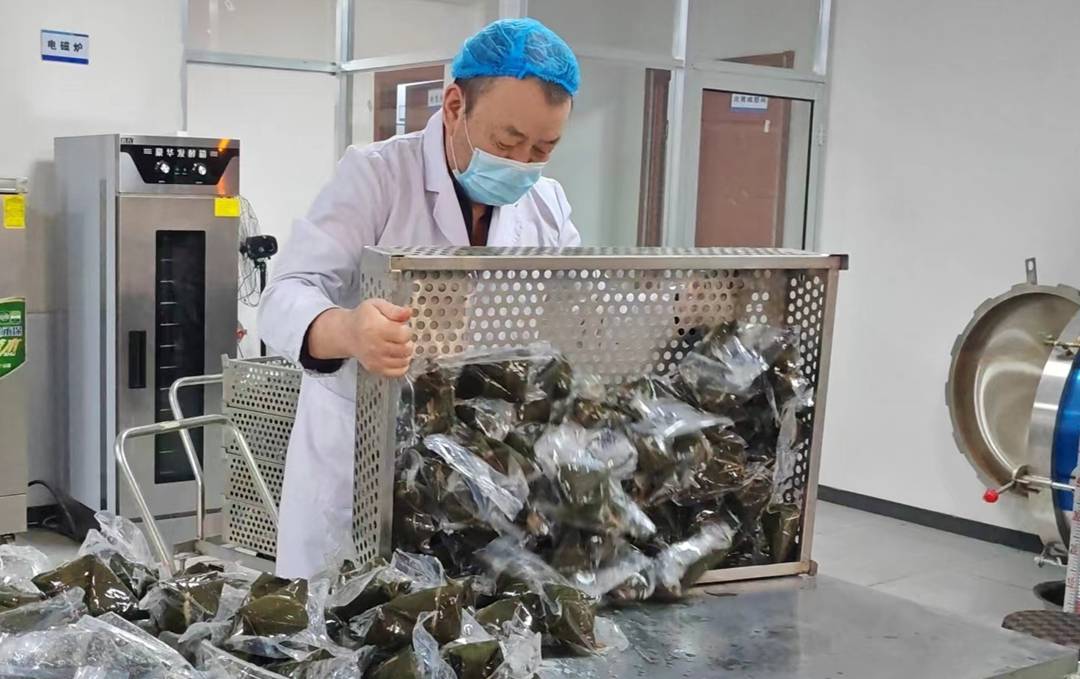 如今,这项古老技艺正焕发新生。为解决保质期短、流通性差的问题,“晋祠有礼”非遗传习中心专门引进了一台全自动杀菌锅,还添置了净水过滤器、真空压缩机、洗米机、发泡桶等设备,让生产流程更加专业化标准化。将初次蒸煮的粽子煮至七八成熟后,取出冲凉晾干进行真空包装。随后分筐推入全自动杀菌锅中用120°以上沸水煮20分钟,再用水蒸气杀菌20分钟,最终冷水喷淋降温出锅,通过高温高压完成对粽子的二次加工和杀菌。出锅后的粽子卫生紧实,品相一流,实现了延长粽子保质期至6个月,让商品走向更广阔的市场。