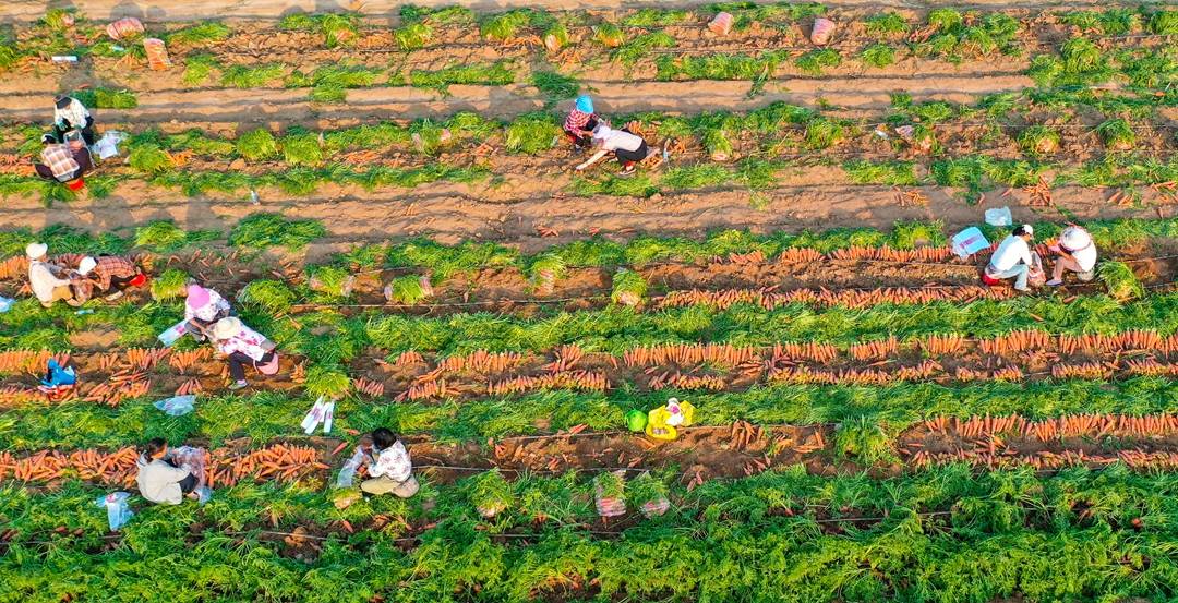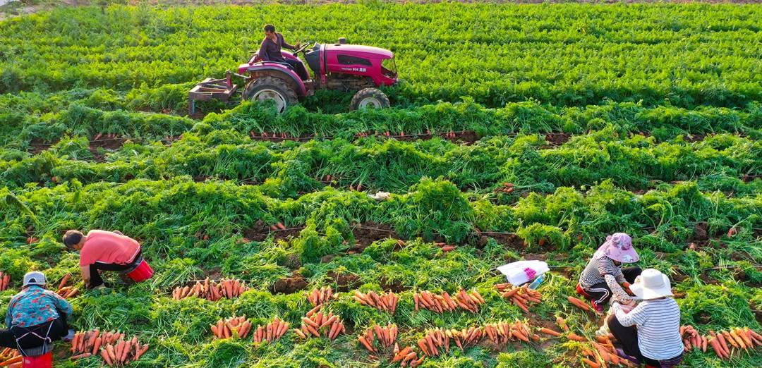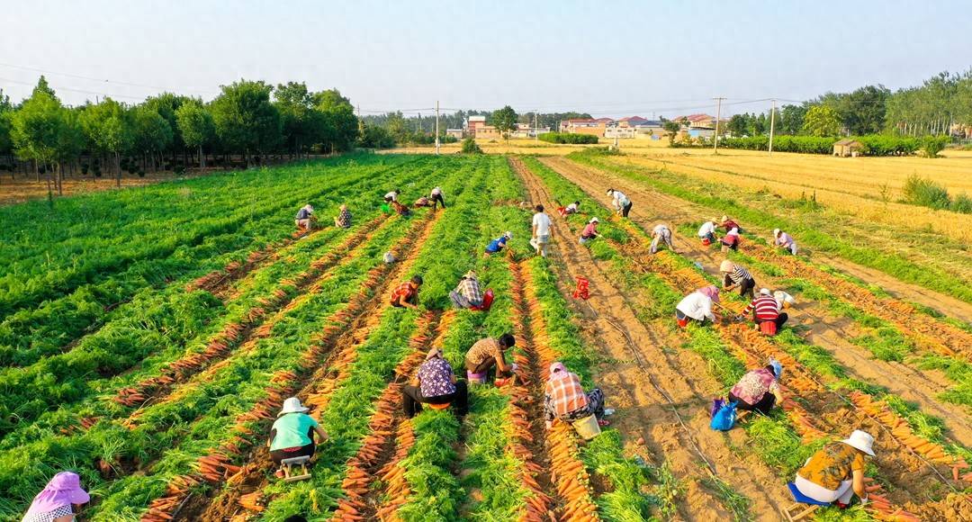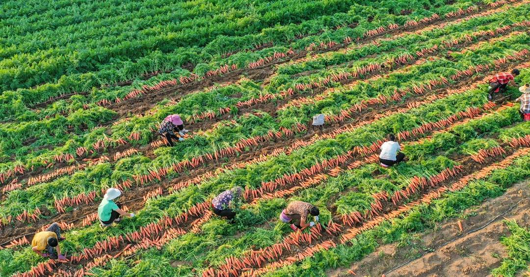 2025年6月12日,夏县瑶峰镇维琪家庭农场,村民正在采收胡萝卜,供应夏季市场。