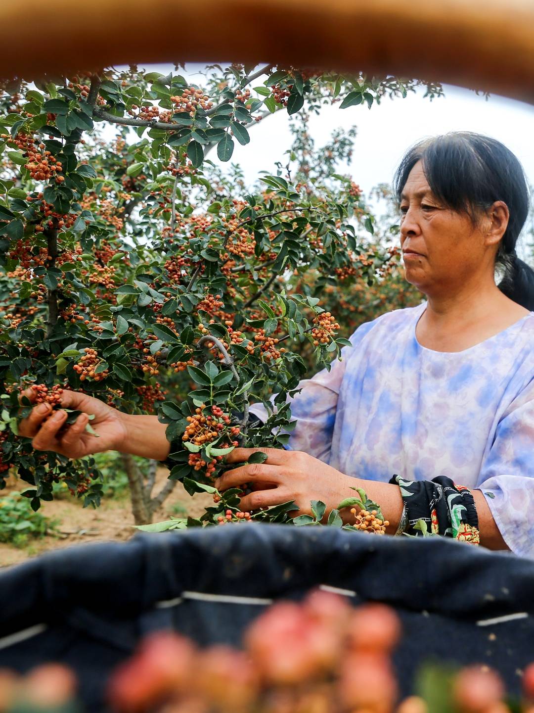 2025年8月21日,夏县庙前镇陈庄村花椒种植基地,村民在忙着采摘花椒。