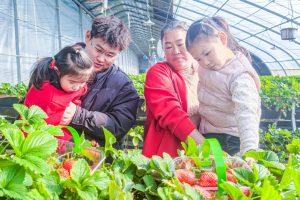 1月16日,几位游客在夏县德兰草莓园自采草莓。 德兰草莓园位于夏县南大里乡,是德兰度假村移动果蔬产业园的一部分…