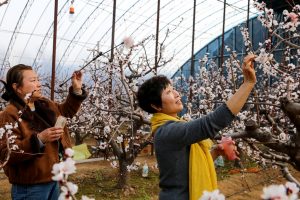 1月27日,来自县城两美女在郭牛村张玉山的大棚里赏桃花、拍抖音。 夏县南大里乡郭牛、北晋等村上百个日光温室里的…