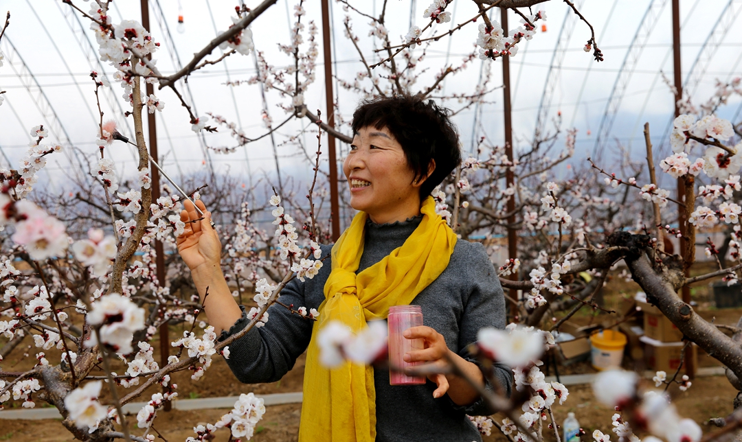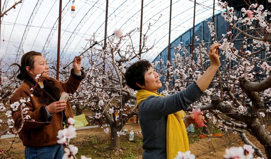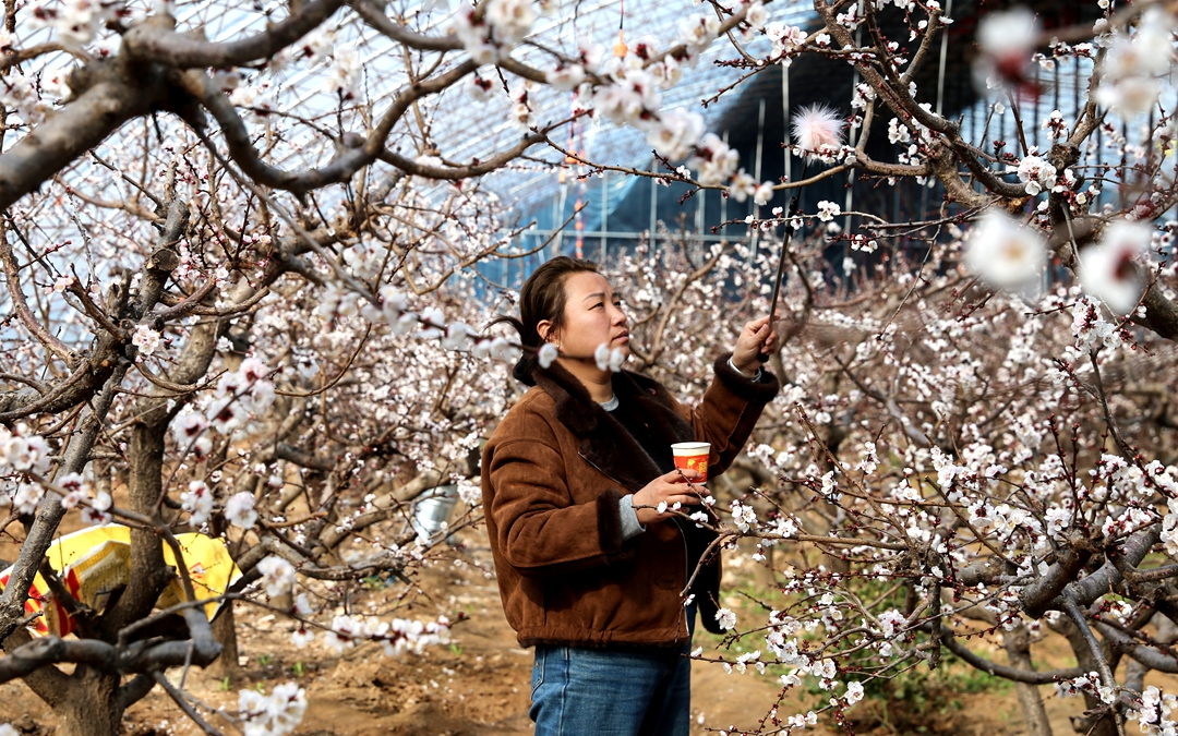 2026年2月4日,夏县瑶峰镇北山底村,村民们在大棚内给杏树进行授粉作业。