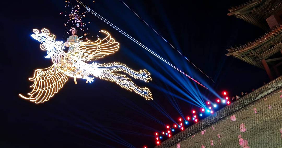 当投影中花瓣飘落,仙女威亚飞天表演惊艳登场。身着唐制仙裙的舞者自城门处乘凤飞起,衣袂如流云舒展,宛若星河坠落人间。她在夜空之中翩然飞舞,撒下花瓣。现场气氛达到高潮,随着点灯仪式完美结束,北门城楼通体璀璨,与全息投影中的龙纹光影、漫天巨型灯彩连成一片,整座城楼化作盛唐天宫,光芒映照下,盛唐晋阳的盛景跃然眼前。