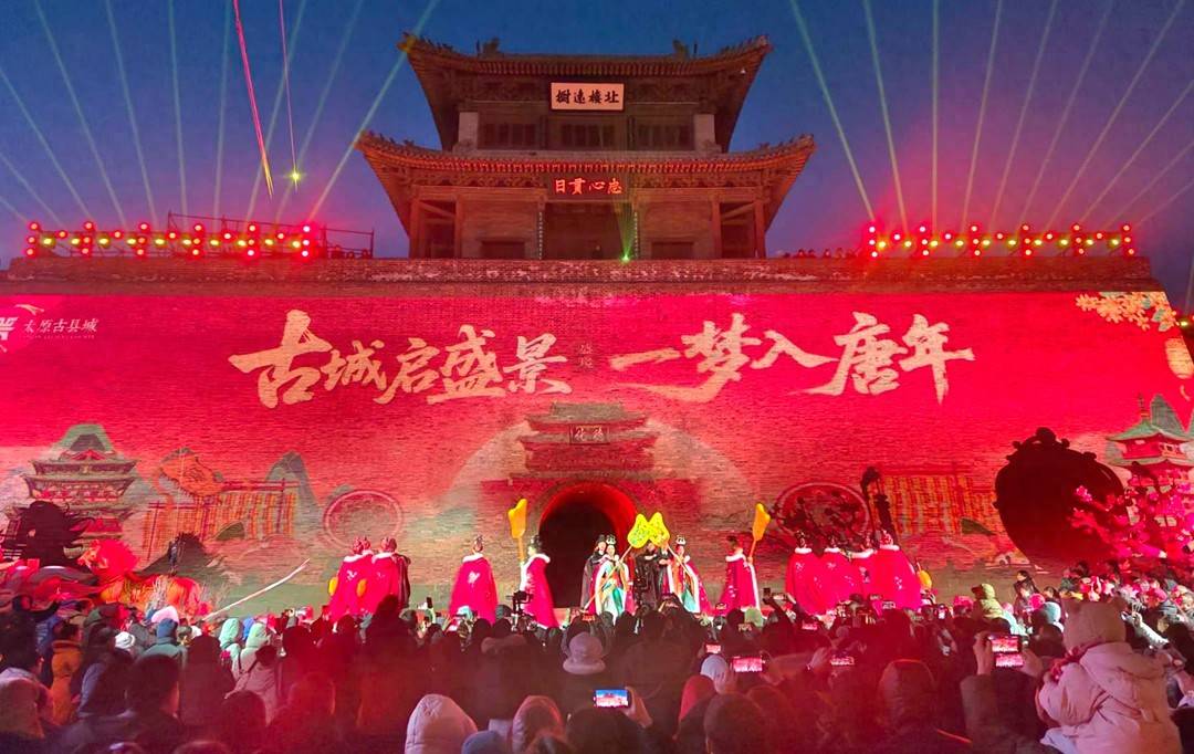 腊月二十三晚18时35分,北门城楼处,一场震撼人心的点灯仪式正式拉开帷幕。此时盛唐礼乐缓缓奏响,编钟古乐与鼓点交叠,浑厚音律穿透夜空。城楼前的唐风舞者身着霓裳,踏着乐声翩跹起舞,衣袂翻飞间,手中宫灯次第点亮。随着礼乐推向高潮,李世民扮相的演员率众臣缓缓而来,行至城楼之下,以古礼祈愿,抬手示意间,尽显盛唐气韵。城楼青砖墙面化作光影画布,晋阳古城的千年兴衰、李世民归晋的浩荡场景、龙兴之地的繁华盛景在墙面流转,虚实交融间,仿佛时空被瞬间折叠。