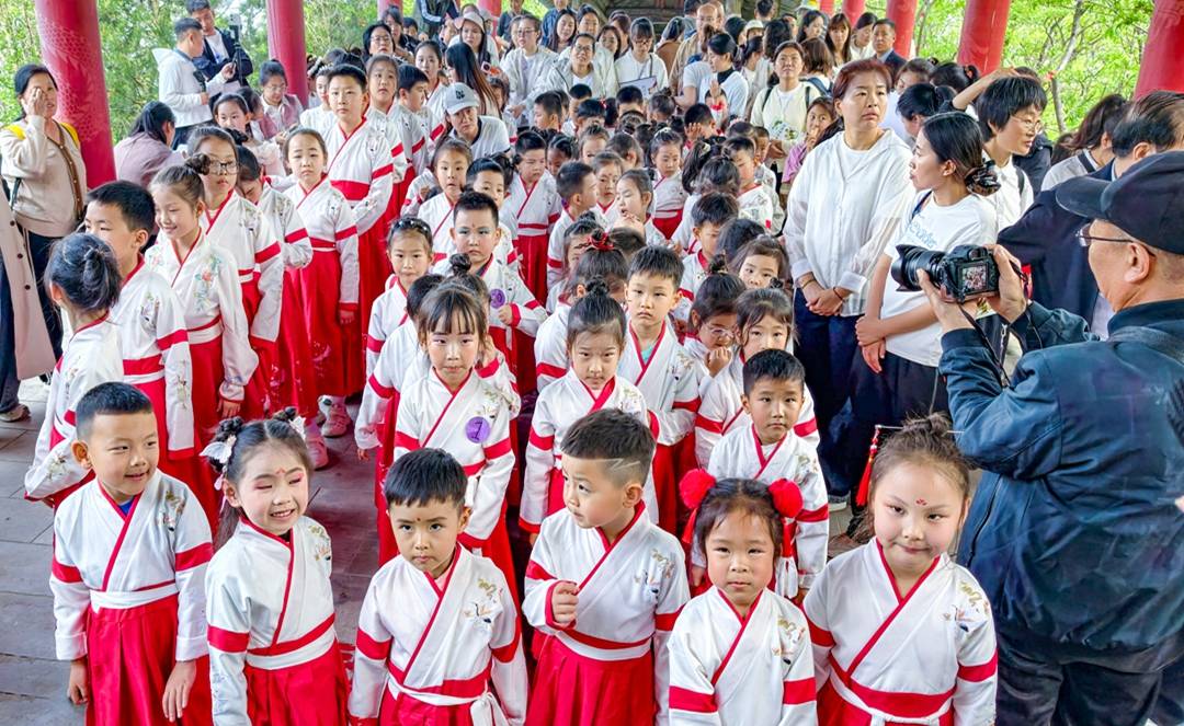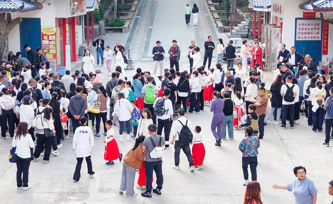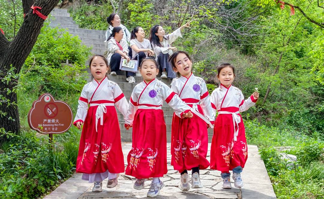 此次活动选址凤凰谷景区,旨在以山水为幕、以经典为媒。活动当天早晨,孩子们身着统一中式服装,在家长陪伴下进入景区后,兴致勃勃地集体乘坐索道,登上山顶文化长廊,与家长共同诵读《裴氏家训》、《司马光家范》、《弟子规》等经典篇目;河东吟诵社数十名会员与儿童一起,以传统吟诵调共同演绎了国学精华,让千年家训在童声朗朗中焕发新生。朗朗的亲子共同诵读声,久久回荡在春天的山谷中。
